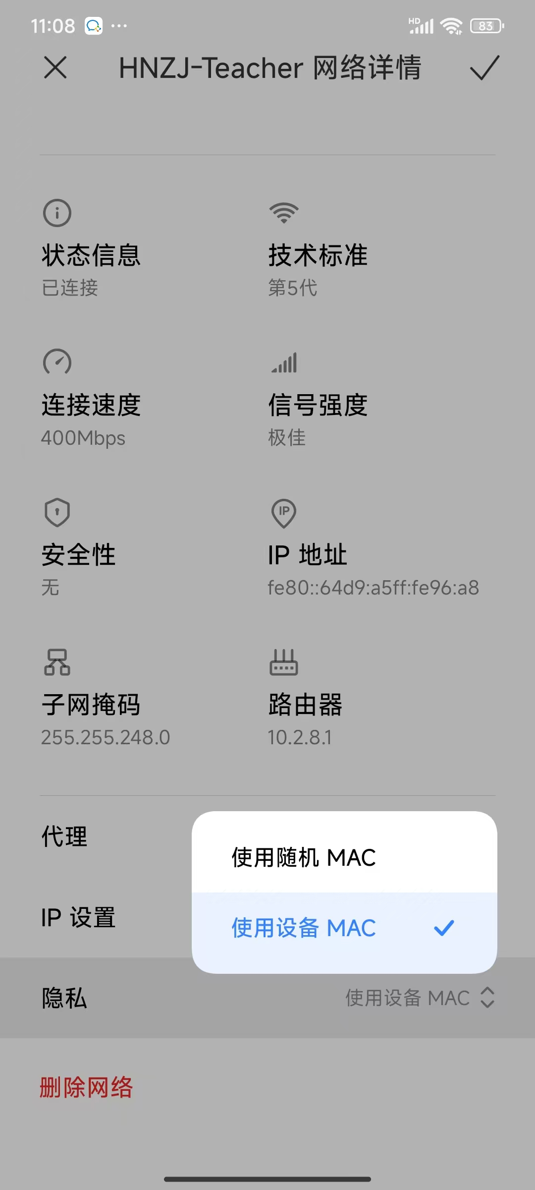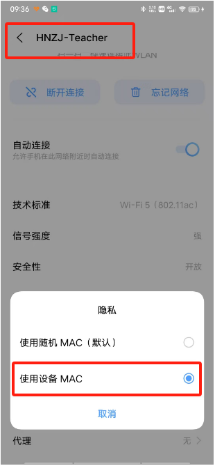 1、华为、荣耀系列手机:在手机设置菜单中点击WLAN选项,长按需要修改的WiFi:“HNZJ-Teacher”,点击修改网络,点击隐私,选择“使用设备MAC”。